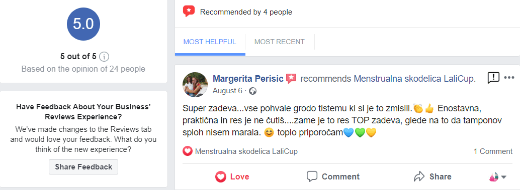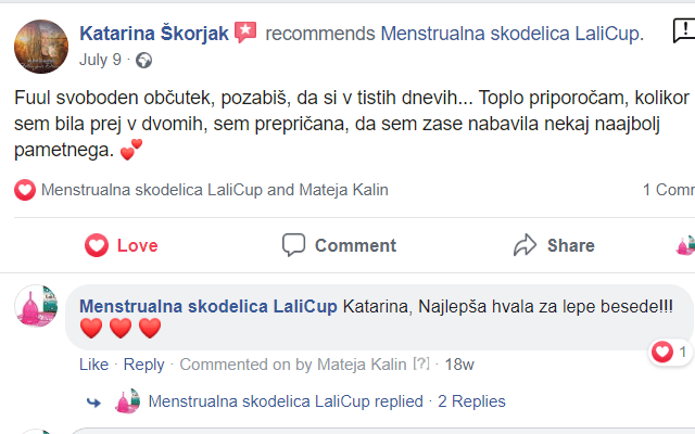 Tako je v naslednjih treh letih v sodelovanju s strokovnjaki, na podlagi moje osebne izkušnje in s pomočjo mnenj uporabnic nastala prva slovenska menstrualna skodelica LaliCup, ki je bila dodelana do popolnosti.